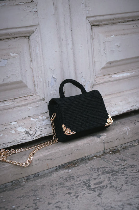 Luxurious Black Hand-Crocheted Bag with Elegant Gold Chain and Clasp | CLARA